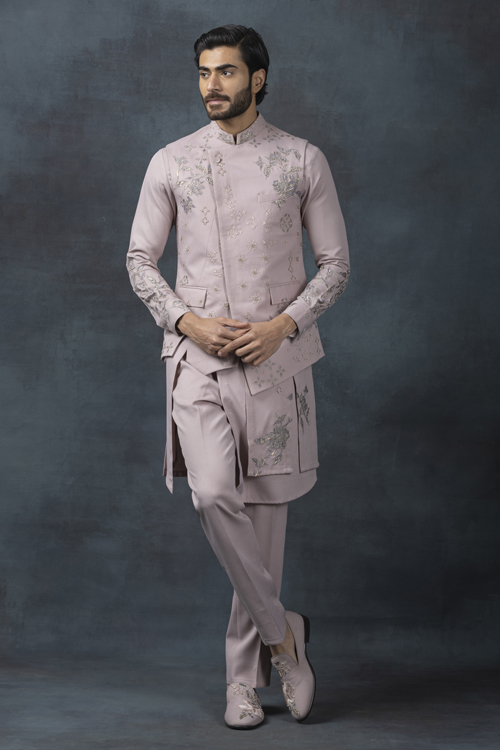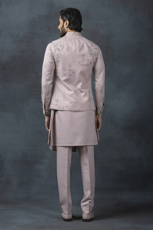 FEATURING LAVENDER WAISTCOAT WITH APLIQUE AND THREAD WORK WITH LAVENDER PANEL KURTA AND PANTS